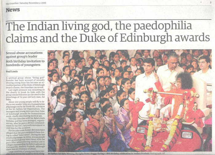 I would also have loved Sai Baba. I just wished that he was not a "homosexual Paedophile." There is a saying that "End justifies the means." There is nothing wrong with cheap magic tricks or to claim oneself as "GOD" for the sake of social upliftment and betterment. But I just can't comprehend the idea that you could rape,molest and sexually abuse young devotees in the name of "Divinity". The following is the latest news article on sai baba. The Indian living god, the paedophilia claims and the Duke of Edinburgh awards · Sexual abuse accusations against group's leader · 80th birthday invitation to hundreds of youngsters Paul Lewis Saturday November 4, 2006 The Guardian A spiritual group whose "living god" founder has been accused of sexually abusing young boys has become an accredited partner of the Duke of Edinburgh award scheme, the Guardian can reveal. Last night pressure was mounting on the charity to break its links with the group whose followers are devoted to the preachings of 79-year-old holy man, Sai Baba. About 200 young people will fly to India in two weeks' time on a humanitarian pilgrimage run by Sai Youth UK, a division of the Sri Sathya Sai Organisation. The teenagers and young men earn their Duke of Edinburgh awards for humanitarian work, chiefly distributing medical aid. The trip coincides with Sai Baba's 80th birthday and has been arranged, organisers say, after he gave a divine commandment for the UK's Sai youth movement to visit him for the occasion. For decades male former devotees have alleged that the guru molested them during so-called "interviews". During the last youth pilgrimage, in 2004, young people were granted group interviews with the guru after administering medical aid to villages surrounding Sai Baba's ashram in Puttaparthi, Andhra Pradesh, although there was no evidence of abuse. Large numbers of young men have travelled from across the world to study alongside and meet the guru. His supporters say their encounter was spiritually enriching. Others, including participants in a BBC programme, The Secret Swami, two years ago, accuse him of abuse, claiming he massaged their testicles with oil and coerced them into oral sex.