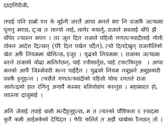 दादागिरीजी, तपाई पनि हाम्रो एन के बुईनी जस्तै आधा मनले भए नि राजाकै जत्थामा पुगनु भएछ, दु:ख त लाग्यो नाई, लागेर क्यार्नु, राजाले सबलाई बाँधे झै बाँधेर ल्याम्न भएन । तर जुन दिन राजाले पहिलो गणतन्त्रवादीलाई गोली ठोक्न आदेश दिन्छन् (धेरै दिन पर्खन पर्दैन), त्यो दिनदेखुन् राजनीतिको खेल अर्कै नियममा खेलिन्छ, हजुर । युद्धको नियममा । राजाका जत्थामा बस्ने राजाको योद्धा मानिनेछन्, चाहे स्वीकार्नुस, चाहे टकटकिनुस । आधा मनको आधै जिम्मेवारी भन्न पाईदैन । युद्धको नियम नबुझने अबुझकारी पक्कै हुनुहुन्न । त्यसैले गणतन्त्रवादीको पहिलो थोपा रगतले राजा ज्ञानेन्द्रको हात रंगिनु अगावै कम्मर बलियोसंग कस्नुस । महाभारत हो, लडम्ला दाजुभाई । अनि जेलाई तपाई बासी भन्दैहुनुहुन्छ, म त त्यस्को पौष्टिकता र स्वादमा कुनै कमी आईसकेको देख्दिन । फेरि कतिले त अझै चाखेका रैनछन् तो ।