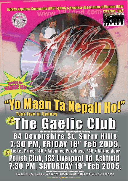 U can get it at door for $ 45 or $40 for prebooking. Venue :friday 18th feb, The Gaelic Club, Surry Hills ( 18+ only, photo id required for entry) Sat 19th feb , Polish club, Ashfield ( family show ) Time: 7:30 PM ...hopefully not nepali time as usual lol
