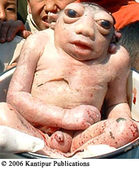 Agree with you Six_Strings. Although I am not a student of biology, I have to recall the Darwin's theory of "Struggle for existence" where he said that only normal genetic behaviour survives in the end. Looks to me like the poor child had some extreme abnormality, although I am not too much sure what kind of (abnormal mutation?), therefore could not survive. I wonder if he was one of his kind only or similar kids were born before as well? Too bad that we don't have good research environment back in Nepal to find out those weird mysteries that the mankind are still not completely aware of. I pray for the eternal peace of the departed soul...