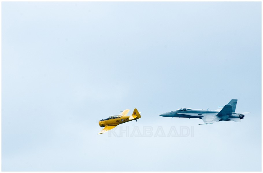 Pic above was like a guy chasing a pretty girl. A vintage aircraft (yellow) being chased by F-18 Hornet (blue).
