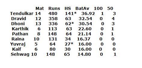 The opinions that Sachin Tendulkar should be dropped from the indian cricket are getting hotter these days. We know in the last two years, he has been in an out with injuries, and is nowhere near is best. But is Sachin that bad that he should be dropped? Lets look at the figures. Following is the stat of the Indian Batsman who have played at least 5 games in the 2006/2007 season including the 3rd ODI in chennai against the West Indies. Mat Runs HS BatAv 100 50 Tendulkar 14 480 141* 36.92 1 3 Dravid 12 358 63 32.54 0 4 Dhoni 13 336 62* 30.54 0 3 Karthik 6 113 63 22.60 0 1 Pathan 8 148 64 21.14 0 1 Raina 10 131 34 16.37 0 0 Yuvraj 5 64 27* 16.00 0 0 Kaif 6 80 30 16.00 0 0 Sehwag 10 148 65 14.80 0 1 Clearly, Sachin tops in run, highest score, and century. Only Dravid has scored one more half century than Sachin, but Dravid's average is less. So after he came back from injury, Sachin has been the best from the Indian team although he is running through bad form. Then how can people shout that Sachin should be dropped from the team? Now lets look at the current world's greatest batsmen in the 2006/2007 season: Mat Runs HS BatAv 100 50 Tendulkar 14 480 141* 36.92 1 3 Ponting 14 460 111 38.33 1 5 Lara 19 472 87 33.71 0 3 Gilchrist 11 298 92 27.09 0 3 Hayden 8 324 117 46.28 1 1 Hussey 14 392 109* 98.00 1 1 Gibbs 9 225 93* 32.14 0 2 Kallis 11 332 119* 36.88 1 1 Strauss 8 210 56 26.25 0 2 Yousuf 5 153 71 51.00 0 1 Ricky ponting is the talk of the show thesedays has performed marginally better than Sachin in average but his total run score is less than sachin in the same no of matches. So Ponting's better average is only because of not-outs. Lara's case is even worse bothe in runs and average. Why dont people talk about Lara and Ponting being dropped when they havent performed as well as sachin? Hussey's average is 98 in the last 14 games but his total score is 392 while Sachin's is 480 in the same no of matches. So Hussey has remained not-out more often as he comes towards the end. See the stats guys. Sachin is going through the worst form of his life, but he has scored more runs than anyone of Ponting, Lara, Youhana, Kallis, or Hussey. But we still love to say that Lara and Ponting are far better as batsman than Sachin. Totally wrong!! Sachin has been named Man of the Match 51 times, which is the highest by any player. The second is Jayasurya, about 40 times and Lara 30 times. Sachin is not my favourite batsman ( I am a fan of Kallis), but I must confess Sachin is the most thrilling to watch. But we still love to say that he isnt a match winner, and is a choker. This is because we expect him to hit century in every other match, go after renouned bowlers every over. Somewhere inside, we think he is the God of Cricket , and we want him to perform like that.