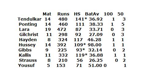 As a batsman, Sachin became the highest scorer in the world cup 95. In 99, he came back from his father's death ceremony, and still played well. In 2003, he was superb again, the only batsman to stannd out so clear. Where were Lara, Ponting all those times? I would excuse Sachin even if he doesnt play that well in this world cup. He will still be the best batsman to me. But even if Sachin doesnt play well, he will probably be better than the rest, or at least most of them.