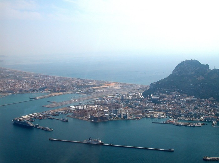 Gibraltar -North Front (GIB / LXGB) Airport overview with the runway 09/27 and the rocks of gibraltar on the right.