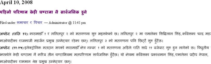 Chyame Kancha Do you know if the election results are being posted anywhere -just curious where you are getting information from - TV webcasts? The election commission's site doesn't have anything yet: http://www.election.gov.np/EN/results/