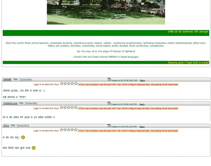 Meet the world's finest school teachers, unbeatable students, mischievous senior citizens, wildest , vacationing revolutionaries, rethinking moderates, instant dreamerspoets, gifted story-tellers, pot smokers, alcoholics, workoholics, home-makers, pretty damsels, fierce contenders, homelanders, laa- hoo-rays, all on the stage of Chautari of Sajhaland (World's first and finest internet IMPROV in Nepali language)