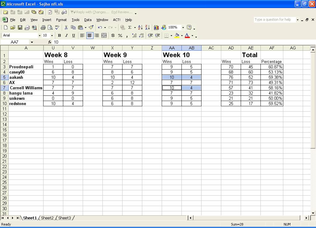 Week 10 results.... carnell and unknown were tied with 10 wins for week 10. I didn't see a single game :=) It's nice ot see porud bro jumping to Tigers bandwagon now ;) what happened to OSU and OU now??? I don't know anything about SEC. When I checked the Coaches Poll this morning, there were 2 teams from PAC-10(USC, Cal) and Big 12 (OU, Texas) conf. I dunno how can you say SEC is better than other conferences. here's the nos of teams from diff conf on coaches top 25 list. Pac-10 : 3 teams Big-12: 4 teams Big-10: 3 teams SEC: 4 teams ACC: 4 teams Auburn and OU still need to play their conf championship game so it's far from over. I wanted to see Badgers to play for the championship game :( aakash bro, yes Huskers will be playing some meaningless bowl game. Did your ead the news abotu the coach, I hope the univ can make that excuse to fire him and bring Barry Alvarez to coach next year or promote Husker great Turner Gill. I am tired of seeing my beloved Huskers as a mediocore team. I want to see power running game and huskers panckaing opponents. Huskers need to win next game agaaints CO Buffaloes and Iowa State (WHO???) Cyclones to lose both game to be eligible for the Big 12 title game. Still got some hope :s