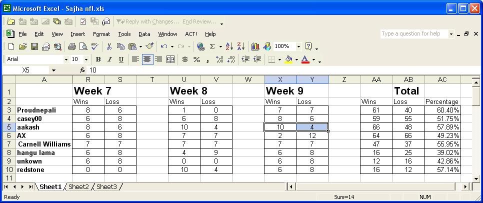 week 9 results: aakash bro is in a roll. getting 10 rights past 2 weekend. i don't think i have done this bad ever. - big Ben and steelers are for real - seems Drew Breese of Chargers going to be most coveted free agent this year. Isn?t he supposed to play great like he is doing when he came out of Purdue? - what?s up with Colts defense? They going anywhere with that kinda defense. Wasn?t Tony Dungy regarded as the defensive genius??? - Dolphins loss was unbearable. They blew the lead in the end and what?s up with Dolphins defense??? Secondary??? It seems coach is going to be fired. Ricky ?POTHEAD? Williams should take all the blame. - cowboys???