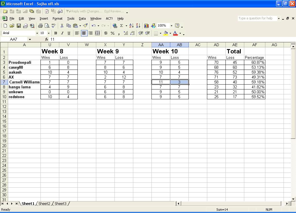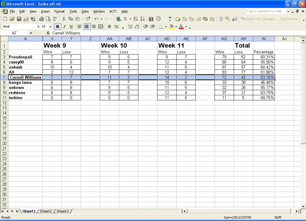 welcome turbine..... Carnell is doing helluva job past few weeks, he leads the sajha nfl league ..... surprisingly no football talk here, is it Artest saga or Sooners convincing win over Baylor??? I don't see SEC fans talking about the title game, wots going on??? I hope Notre Dame will win over USC to salvage thier year. results from week 11....