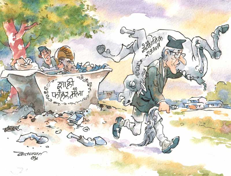 I have one suggestion for the fungi bred in Narayanhiti. Pretentious self-contentment with the aid of pathetic complaints against one republican might not deliver as good a result as by joining the shoulder with Girija in this cartoon.