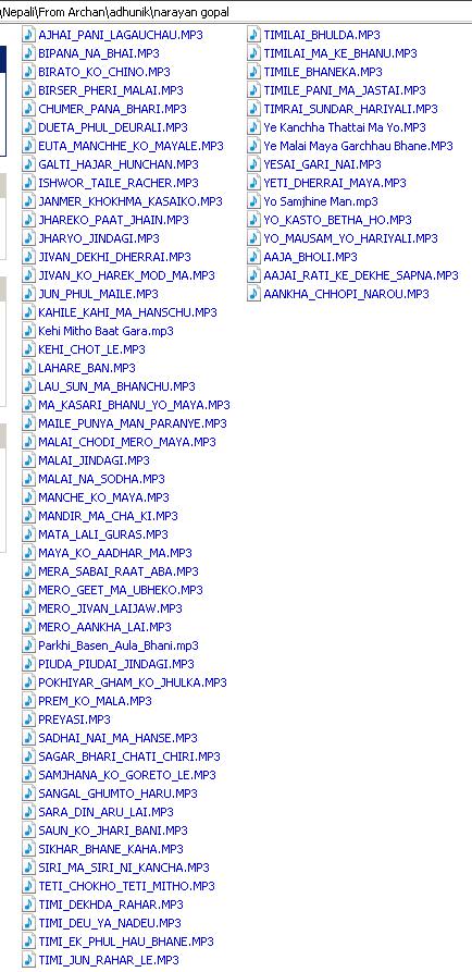 nepalean I am afraid I do not have much of Ram krishna dhakal's song The ones I have are: 1. अझै पनि लजौछौ बेहुली झै उसै गरी 2. मेरो मर्म बुझेर बादल 3. तिम्रो आगमनले फेरी 4. तिम्रो रहर मेरो रहर ------------------------------------------ नारायण गोपाल को "गल्ती हजार हुन्छ" .