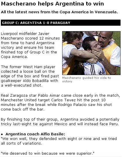 Yet another comfortable victory! Argentina are through. Tevez had a great game, the subs chipped in well as well. Tevez was unlucky not to have scored when he hit the cross bar! As far as the heigh is concerned, height matters less as long as a player is qualitative! Messi, Saviola, Aimar, Tevez, Mascherano are all "shorter" than others but it doesn't make any difference! I don't want Crouchies in place of Tevez at Old Trafford! Bring it on1