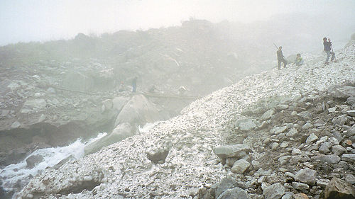 हिमालय र देउराली बीचको बाटो अघिल्लो रातिको हिउँ पहिरो (avalanche)ले अवरुद्ध भएको थियो। स्थानीय लजका कर्मचारीहरु बाटो खोल्ने प्रयास गर्दैछन। त्यहाँ देखिएको खोला माथिको पुल पनि पहिरोले लगेको हुँदा एउटा अस्थायी पुल राखिएको थियो, काठका फल्याकहरुलाई डोरिले बाँधेर। हामी त्यहाँ पुगुन्जेल् जसो तसो बाटो पार गर्न मिल्ने भएको थियो।