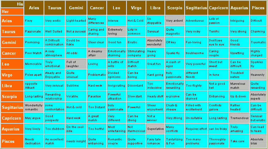 shwetaa You have got the entire chart !! ..hmmm !!... Liked that one...The chart says Aries and Virgo are "Poles Apart". This might not be always true for every instance however I found this reallty true at least at one instance in my life. Virgos like to look at even the finest details..for which Aries simply dont have the patience...... Are you Virgo..?