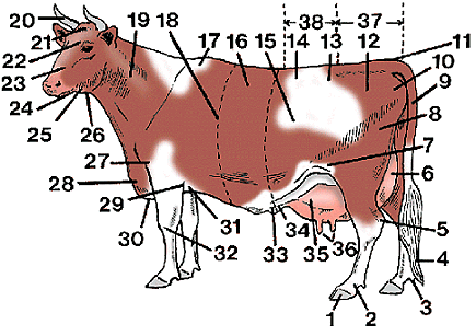 . cow 1a: 1 hoof, 2 pastern, 3 dewclaw, 4 switch, 5 hock, 6 rear udder, 7 flank, 8 thigh, 9 tail, 10 pinbone, 11 tail head, 12 thurl, 13 hip, 14 barrel, 15 ribs, 16 crops, 17 withers, 18 heart girth, 19 neck, 20 horn, 21 poll, 22 forehead, 23 bridge of nose, 24 muzzle, 25 jaw, 26 throat, 27 point of shoulder, 28 dewlap, 29 point of elbow, 30 brisket, 31 chest floor, 32 knee, 33 milk well, 34 milk vein, 35 fore udder, 36 teats, 37 rump, 38 loin .