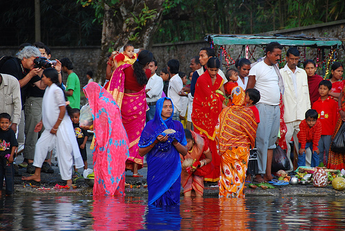 Chatthh parwa, Terai women worshipping the Sun god in Phewa Lake. In order to pray the Sun, they would have had to go across the lake, on the other side and face towards east to worship. The Phewa Lake Management Team tried quite hard to make special arrangement for the devotees so they did not have to go quite far across the lake and do their prayers. They add diversity to the population of Pokhara.