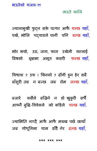 बाफ रे भौउते कति सलाम गर्नु हो ? I think I should keep salutes for bhaute in a godown. त्यो आँ र ढाँ चेन्ज गर्न सकिन्न र भन्या ? ति दुईटामा नाके स्बर आयो के in comparision to the rest of kaffiaa. अब छ न्द मा लेख्ने गरे बेश होला This ghazal could be preety much converted into "SAWAI" with 14 syllables. if you can give me your address I will copy the types of "behers" of ghazals from "chanda parag" and send it to you.