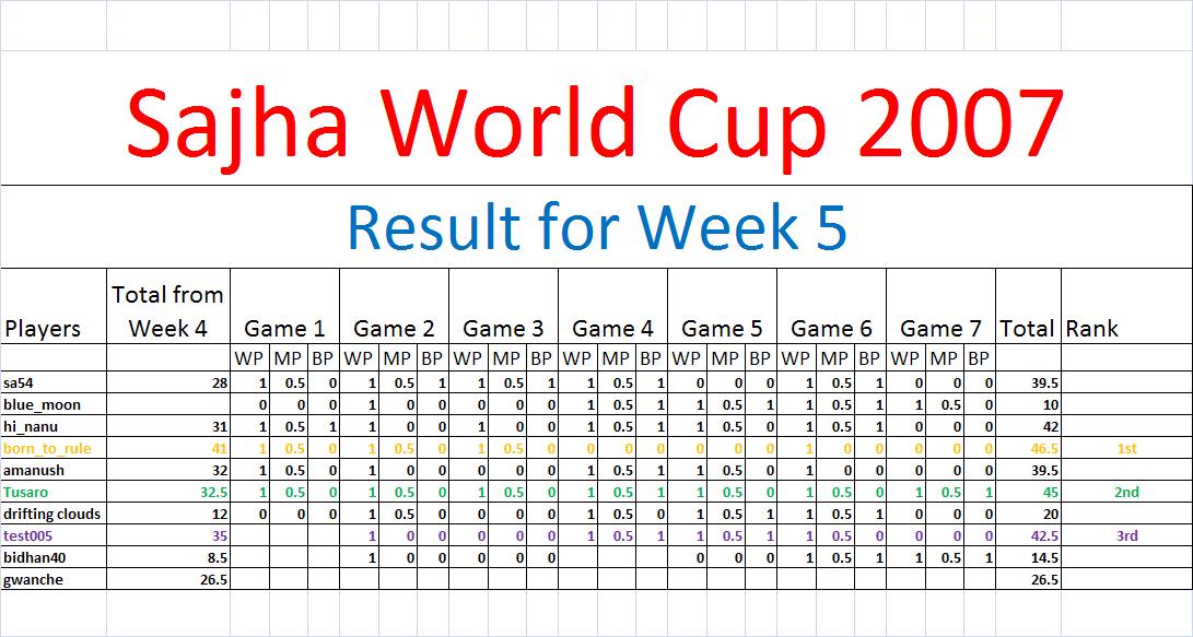 Probably this week we played some of the most difficult games here at Sajha World Cup 2007. The matches between big guns made it very hard to predict. And the score by the end of WEEK 5 says it all ! This was the week for sa54 where he played some wonderful innings and went home with 4 'man of the matches' including a hatrick from game 2 to 4. The other player to watch this week was Tusaro. If you remember, he had just climbed to 3rd spot last week pushing amanush to 4th spot by a narrow margin of 0.5. This week he has climbed another spot to be crowned with 2nd position to upset test005. Born_to_rule probably will have some sleepless nights this week ! 3 duck outs for born_to_rule this week might cost arms and legs next week. So, here I present you the total Result by the end of WEEK 5: