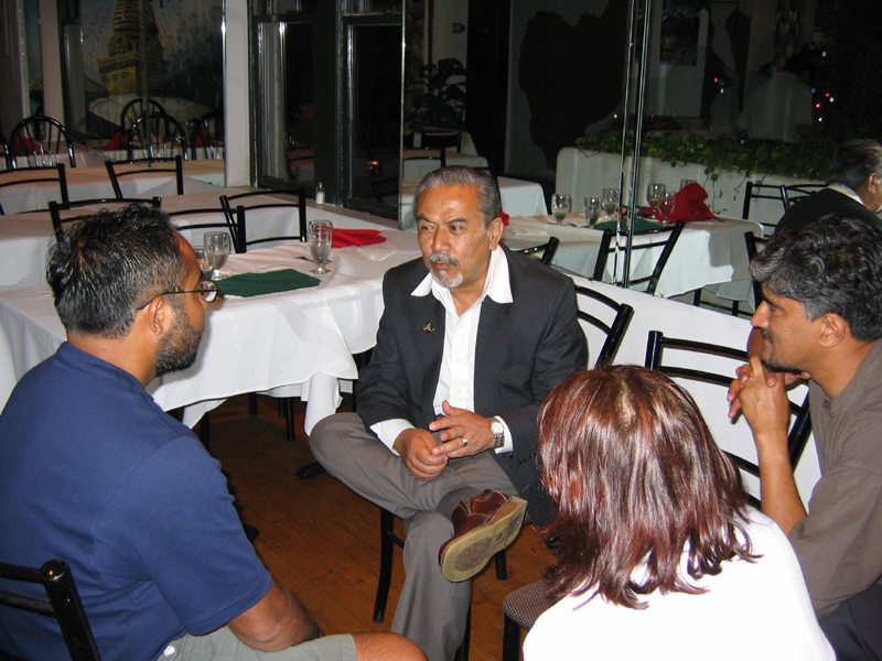 PQNo1 and other friends, First of all, thank you for wondering about me and our good old friend Biswo. I hope Biswo ji will log in soon and satisfy our curiosity about him. As for me, although I have not been able to be as regular as I have been in the past, I have no intention to retire from Sajha- as a poster and a reader. I am a man with a mission (thank you, Bond007 ji) and there is too much to be missed if I quit Sajha. And on top of that there is an emotional attachment- through the memory of some wonderful people I met in the past, people I am in touch with, both on line and off line, now and perhaps by the emotional investment I have made since I joined Sajha some three years ago. Emodus ji brings up a sad part of our lives in Sajha. I am perfectly comfortable with heated arguments on ideas (In fact, that's what attracted me to Sajha when I joined). However, I think it is true that incidents of personal bashing at times poisoned the atmosphere of Sajha. But I am also aware that this is unavoidable. Preaching does not help. We just have to accept it as a part of our cyber life. Personal bashing (cf. bashing of ideas) predominates when you run out of ideas. If you look at PB wars in this light, you might get new insights. Perhaps we can call it learning from the negatives. ******************** Deep, Thanks for your remarks. But I must confess, it's too hard for me to comprehend your poetic remarks. Oh how I wish, you write as simple, as innocent, as gripping as your stories are written. ***************** Ashu, Thanks for liking this hurried attempt of mine. Unlike some of my readers might think, poetry does not come naturally to me. For me, it takes months to finish one piece. And this one was one day's labor. Though yet rough in make up, I guess I was trying to convey man's eternal fascination to rebellion and accommodation to human limits. Pleasure to learn about your meeting with my friend. You were talking about our mutual friend, if I may suppose. And good to see you keeping on reporting interesting news to Sajha from home. ************* Now to friends wondering how I must be spending my time, here is one picture give an example. Posing for a picture with a who's who from Kathmandu in DC.