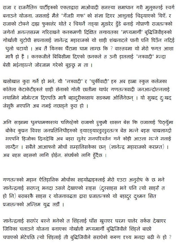राजा र राजनैतिक पार्टीहरुको एकताद्वारा माओवादी समस्या समाधान गरी मुलुकलाई स्वर्ग बनाउने योजना, जसलाई मैले "गँजडी गफ" को संज्ञा दिएर आशुलाई चिढ्याएको थिएँ, र राजाको टोक्ने दाह्रा फुकालेर थोते र चिथर्ने नङ्ग्रा मुठारेर डुँडे बनाई गोप्राणी राजतन्त्रको जगेर्ना अनन्तसम्म गरिराखने कनकमणी दिक्षित लगायतका "मध्यमार्गी" बुद्धिजिवीहरुको गोर्खाली युटोपी सपनालाई ज्ञानेन्द्र महाराजको यो शाही शंखनादले पानी पनि पिउँन नदिई धुलो चटायो । अब तै यिनका घैंटामा घाम लाग्छ कि ? वास्तवमा यो मेरो फगत आशा मात्रै हो है । कनकजीले बिबिसीमा दिएको छनकले त उनी हाललाई "नत्रवादी" भन्दा बेसी भईनहाल्ने जोरजाम गरेको बुझ्छु म ता । खसोखास कुरा गर्ने हो भने, यी "नत्रवादी" र "घुर्कीवादी" हरु अब हाम्रा स्कुल कलेजका कलिला केटाकेटीहरुले शाही सेनाको गोली छातीमा थापेर गणतन्त्रवादी जनआन्दोलनलाई नथामिने मोमेन्टम दिएपछि मात्रै बहादुरीकासाथ सडकमा ओर्लिनेछन् । यो सुखद दु:खद जेसुकै भएपनि अब नभई नछाड्ने कुरा हो ।