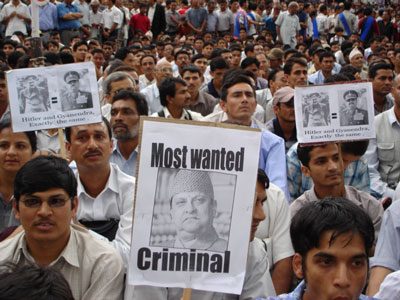 Yup.. Photoshop work. Very simple reason. check out the placards with hitler and Gynae's picture. The color intensity of sign "=" is deeper than the other texts. The "Most Wanted Criminal" is not aligned with the edge of the picture.... Now don't tell me that the printed separately the texts and pasted over the picture. And also note that the color intensity of the picture is so dim compared to the texts!!! Nepal ko patrika le je pani garchha.... dhoti le paisa dhiyo hola.... ani photoshop ko kamal chalayo hola.