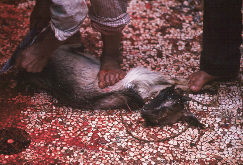 http://www.stopsacrifice.org/ Animal Sacrifices for Religious reasons is a common part of Nepalese life. Most Nepalese sacrifice for appeasing the gods for the well-being of one's family. While in the western world this would be termed sheer barbarism, in Nepal the practice continues unabated under the garb of protecting one's culture. Nothing can be far from the truth since human sacrifices have stopped. IF HUMANS CANNOT APPEASE THE GOD'S THEN HOW CAN THE INNOCENT ANIMALS? DASAIN OR DUSHHERA,THE MAJOR HINDU FESTIVAL WHICH IS CELEBRATED BY HINDUS OF NEPAL BY SACRIFICING GOATS, COCKS, DOVES AND BUFFALOES TO GODDESS KALI BEGAN FROM OCT 7th.THE GORY FESTIVAL LASTED FOR 15 DAYS. KING OF NEPAL SACRIFICES 10 BLACK-HE GOATS (news title:Royal couple offers special prayers)