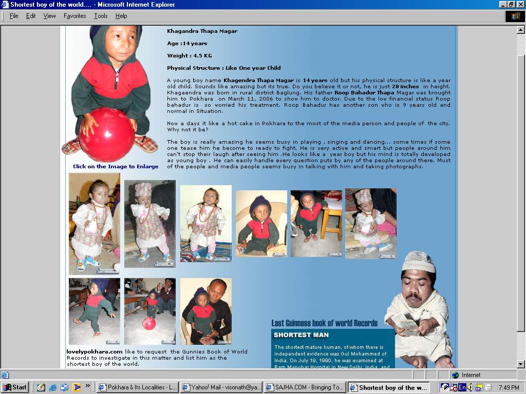May be The shortest boy of the world Khagandra Thapa Magar Age :14 years Weight : 4.5 KG Physical Structure : Like One year Child A young boy name Khagendra Thapa Magar is 14 years old but his physical structure is like a year old child. Sounds like amazing but its true. Do you believe it or not, he is just 20 inches in height. Khagaendra was born in rural district Baglung. His father Roop Bahadur Thapa Magar was brought him to Pokhara on March 11, 2006 to show him to doctor. Due to the low financial status Roop bahadur is so worried his treatment. Roop Bahadur has another son who is 9 years old and normal in Situation. Now a days it like a hot cake in Pokhara to the most of the media person and people of the city. Why not it be? The boy is really amazing he seems busy in playing , singing and dancing... some times if some one tease him he become to ready to fight. He is very active and smart but people around him can't stop their laugh after seeing him .He looks like a year boy but his mind is totally developed as young boy . He can easily handle every question puts by any of the people around there. Must of the people and media people seems busy in talking with him and taking photographs.