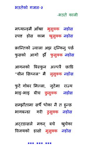 My friend, Dipesh B. had imagined today a year ago in this poem. ------------------------------------------------------------------------------- आगो बल्यो, सानो आगो शुरुमा घाम पानी खाएका सालका चिर्पटहरू अति भयो बञ्चरोको चोट सहन सकिन्न अब भनेर आफै होमिए आगो बिस्तारै ठूलो भयो आगो, त्यो क्रान्तिको आगो बढ्दै गयो चोइटाहरू होमिदै गए बञ्चरोको मारले उच्छिट्टिएका चोइटाहरू अलिकति यहाँको चोइटा अलिकति त्यहाँको चोइटा आगो अब ठूलो भयो सालका चिर्पटहरू सकिए चोइटाहरू पनि सकिए आगो निभ्न चाहेन वरिपरिका हरिया झारपात, घाँसपात होमिए धुवाँ पुत्लायो आगो निभेको हो कि जस्तो भयो भित्र आगो क्रान्तितर शक्ति शोस्दै थियो हरिया घाँस र झारपातबाट सुके हरिया पातहरू खोक्रा भए अनि, आगो फेरि दन्कियो पहिले भन्दा शक्तिशाली भएर निर्लज्जरुपमा घाँस र झारपातहरू होमिदै गए आगो पुत्लाउँदै अनि शक्तिशाली हुँदै बल्दै गयो घरहरू होमिन थाले, गाउँहरू होमिन थाले आगोले जंगल खायो सालका बुट्यानहरू पनि होमिए ठूलो नहुँदै अनि आगो निभाउन हिंडेकाहरू पानी भनेर, मट्टितेल छर्कँदैछन् आगो दन्किदो छ। ---------------- पौष १३, २०६१