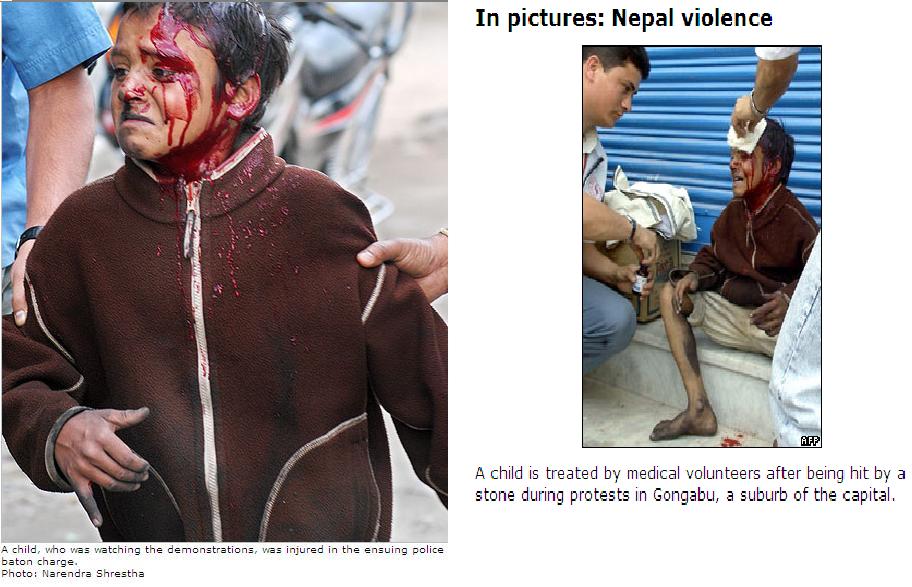 look at the picture it's the same boy BBC says he was hit by a stone but Kantipur goes on and says that he was beaten by police. i thought kantipur was a respectable news media why is it doing false propoganda ????