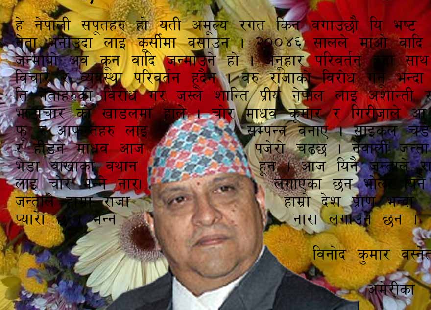 There are very few coutries with kings around the world.Just believe in democracy and its norms, it will guide everything. We just do not want this white elephant for nothing. One good son of a Nepalese mother can do his job with a very few salary( Gyane le jasto kar ko paisa afno bau ko ta thandaina).Everybody has lots of blood bathing, let's stop it in a way or the other. A bird in hand will worth two in the bush.Look at the Nepalese political history,Communist like maoist have come to the political main stream. We should believe maoist for the time being.