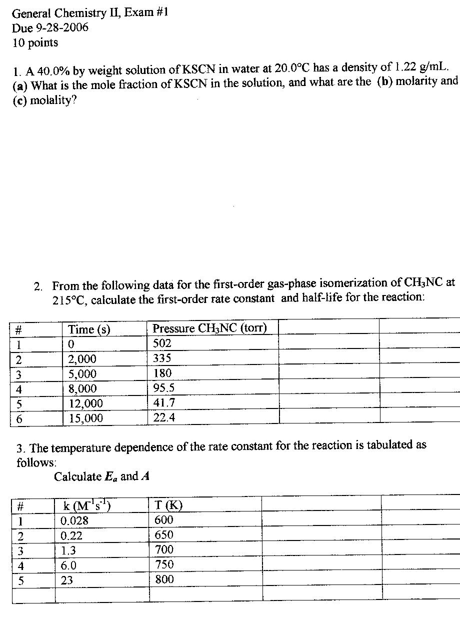 Solution for question no. 1 Molarity= Moles/L Density is given, so we can use it as a conversion factor,(* = Multiply) 1.22g/1mL * 1000mL/1L * 1mol/97.19g = 12.56 mol/L = Molarity Molality = moles of solute/ kg of solvent Lets us consider 100 g of solution. Then we have 40g of solute(KSCN) g of solvent = 100g - 40g = 60g of solvent = 0.06 kg of solvent so, 12.56mol/0.06kg= 209.33mol/kg= Molality Mole fraction of KSCN= Moles of KSCN/ Sum of moles of all component Try this yourself.