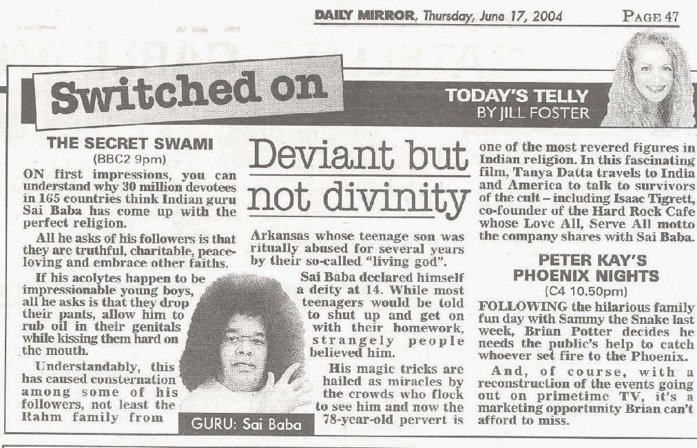 Indian Doti and their Tantrik (Hypnotism), kali devi, Mata, Guri, Baba - all these criminal, selfish, Lazy, Cult and corrupted people ruin Nepal, India and Bangaladesh. It is 21st century.... people are searching another planet for home and travelling. We must be wake up... and think why we are behind in development... why we have poor and bad mentality. We must THINK...think... THINK... SAY NO CULT BABA, GURU, DEVI AND CULT RELIGION..... READ BELOW REPORTS.... BBC report mad man? http://news.bbc.co.uk/2/hi/programmes/this_world/3813469.stm Swami secret: http://news.bbc.co.uk/2/hi/programmes/this_world/3791921.stm News report: http://www.saiguru.net/english/news/040625britishpressreviewsbbc.htm BBC Report about Sai Baba: http://wisedonkey.blogspot.com/2005/01/sai-baba-maybe-godman-but-bbc-is-god.html Sai Baba is Guilty or innocent? http://home.no.net/anir/Sai/enigma/guilt.htm http://www.rickross.com/reference/saibaba/saibaba15.html Petition for investigation: http://www.saipetition.net/ Murder at Sai baba ashram: http://www.saisathyasai.com/baba/Ex-Baba.com/Murders/murders-robert-priddy.html