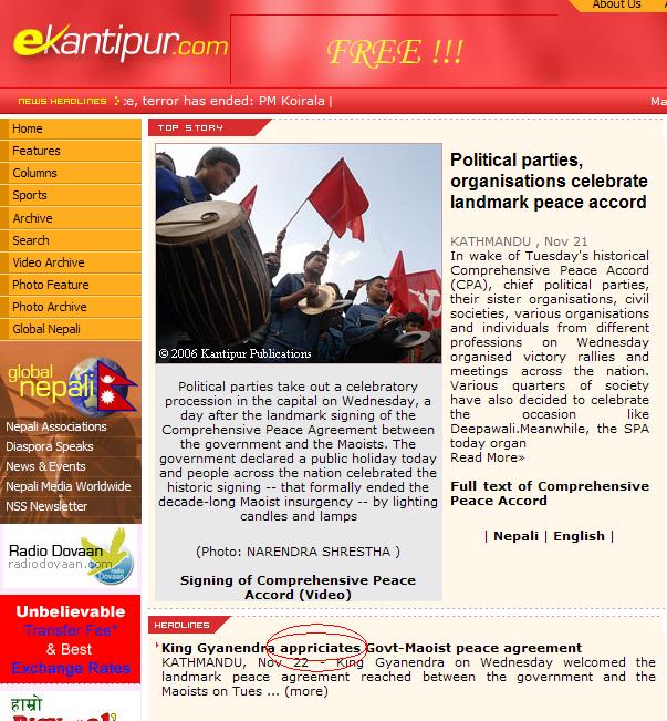 The king's hailing the peace accord simply means the palace's PR machinery has kicked into high gears ... the king is trying to stay relevant as developments unfold in Nepal rendering him, and more importantly, the institution of monarchy increasingly irrelevant. This peace accord would not have happened under Gyane's watch, so his hailing it can be construed as his tacit admission of failures as the chairman of the council of ministers (made up of his chamchas) of his the then government to bring peace to the country. If tomorrow the Supreme Court were to hand down a judgement against Gyane for perpetrating atrocities against the Jan Andola -2 protestors and citizens (as the chairman of the said council of ministers), do you think he would hail that, too, as a positive development? I don't think so. Mind you, the Rayamajhi Commission report has accused Gyane of a larger crime - of masterminding the atrocities committed against citizens during his autocratic rule. As all signs point to the inevitability of the Constituent Assembly elections, the stakes for the king and the institution of monarchy (albeit ceremonial monarchy) have never been greater. The palace and all the reactionary forces must now campaign to affect the outcomes of the elections in their favor. Methinks the king's hailing of the the peace accord signals that the palace's campaign has only just begun in earnest.
