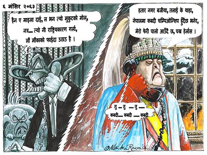 I am not praising any party leaders but since Kings for the last twelve generations had free reign over the country, national treasury and army they should be responsible what caused downward mobility in Nepalis people's life. All the property he has amassed is without paying taxes, duties and so on. In accurate terms, it is by exploiting people and being above law. Whoever licked his butt became vice president even when he had to be brought to the country from hiding abroad by defaulting loan. Who spoke against him were arrested under the house and ordinary people were disappeared. There is hardly any difference between Maoists and King. Both are autai dyangka mula. If Maoists killed 13000 (half or more is by then RNA) people, it's the King who gave birth to Maoists and caused all this conflict. If he is a true leader, why can't he step aside now and declare Nepal a republic. That will be eight wonder of the world. Still, I would like to see it.