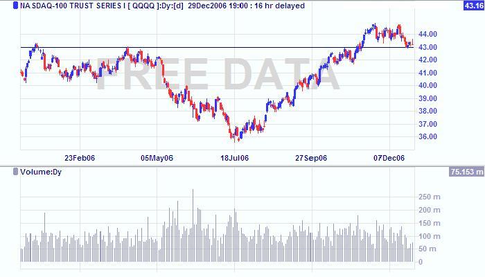 I agree with eminitrader. Look at the chart of the QQQQ fellers. If this baby breaks through that long black resistance across the chart and goes downwards, I believe it is an early sign that overall markets will see a correction. For those who don't know what the QQQQ is, in layman's words, it just tracks the 100 top stocks in NASDAQ and are highly correlated with NASDAQ. It's an ETF- Exchange Traded Fund. In my previous post I explaiened to someone that an ETF is like a mutual fund, except it can be traded like stocks. Tracking this can show early promising signs of overall market conditions