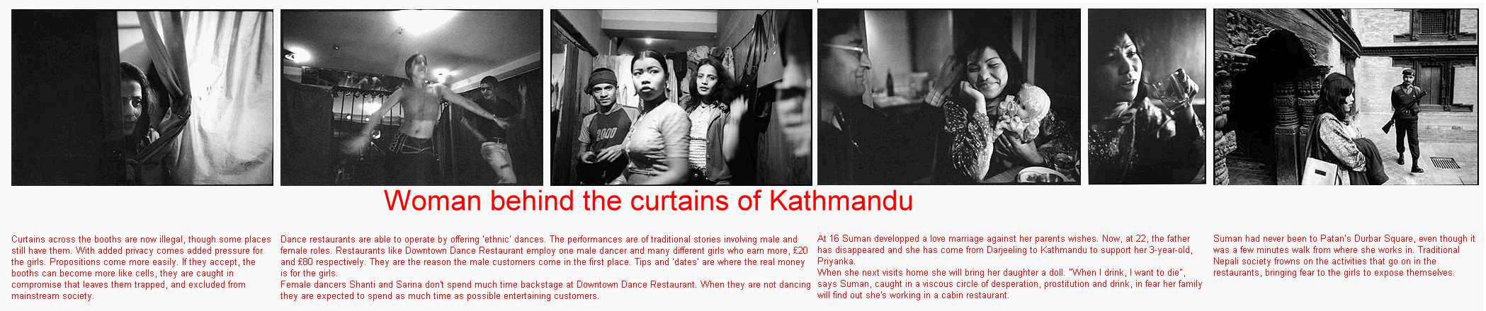 Dipa Tamang, 26, is a dancer with the Galaxy Dance and Shower Bar in the busy Sundhara area of Kathmandu, a downmarket commercial road near the bus stations. Although an accomplished dancer, Tamang will not find work with a dance troupe because her face was badly scarred in an accident. With a four-year-old child to care for, deserted by her husband, and educated only up to Class 7, the dim light of the dance bar and the garish makeup she uses to hide her scars are her only haven.