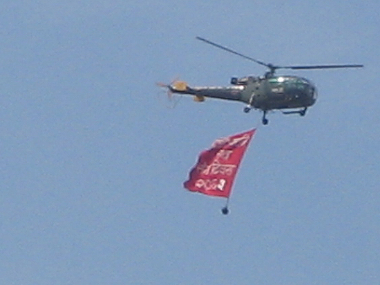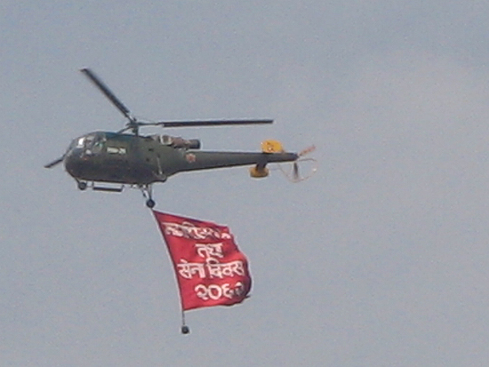 Today was Maha Shivaratri and Army Day 2063 or was it 2062 or may be both. I have something very interesting to share.I was enjoying the sunshine this afternoon when I noticed two army choppers flying in the sky,both these choppers were carrying some kind of a flag,the first chopper had a flag where it was written " MAHA SHIVA RATRI AND ARMY DAY 2007" in English which was ... ........................followed by another chopper where the writing was in Nepali ,to my biggest surprise I noticed that on one side of the flag the date was 2063, the 3 of which was over written in possibly a flag from last year but the concerned failed to check that the other side of the flag still had 2062,one side had 2063 and the other side 2062.The chopper flew over Kathmandu a few times with this flag.I ran to my room took out my camera and managed to click pictures,while the choppers where making their final rounds with great pride during their Army Day.This is sheer stupidity and extreme heights of carelessness.May be Nepalese Army does not want to change with the changing times or is reluctant to do so. i have something more to add,people talk about amendment in the constitution.Well I have one suggestion…..no one should be treated special within temple premises,if wanna worship stay in the line if not you wont be allowed in.Everyone should be treated the same...Can someone please provide me with the data,what is the number of people who faint or need to been rushed to hospitals during these special festival when the crowd are made to wait for hours and hours for the VVIPs to arrive.What is the percentage of elderly who are made to wait to the VVIPs to finish their puja.I wonder weather we have acheived loktantra,is everyone equal???What I have heard this year,was that no special passes where distributed,for the so called"special guests" visiting the temple.Why need special passes,why only a handful of people get to enjoy all the privileges in Nepal,"the VVIPs and their acquaintances".What I am concerned is those people with no passes need to queue up for hours and hours and handful of people get special passes,I think no one has raised this issue seriously,where are people who talk about LOKTANTRA??????I think the politicians themselves want to enjoy this privilege.Does one need to call for a Nepal Banda or Valley Banda for issues like these to be addressed.