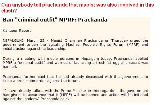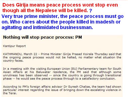first of all what freaking peace process????the maoists aren't freaking willing to do anything towards peace...they still want things exactly how they wanted it earlier...jsut that now they in ktm and taking it from the freaking SPA crap ........look at the arms registration.....the registration of 35000 ppl i their camps.....and loads of them minors (as per ian martin) .a lot of the 35000 ppl they drummed up were all recruited a week or so around the freaking signing of that so called peace pact......the maoists want more than they shld be getting...if they shld be getting anything at all.........but if they wanna keep decieving the freaking ppl...and the ppl wanna be decieved...so be it....... abt who was responsible for what happened in gaur.....its the freaking maoists first and foremost obviously.....they gave birth to the likes of MPRF and JTMM and what not.... they were the ones who taught ppl that violence can get ppl in power to listen to u.....if only for a short time.......and anwaysy why was the freaking thing being held at the same place........they were lookign for a fight both those freaking grps.... what were they doing with arms??? u just know they knew there was gonna be need for arms......and u bet a lot of peeps came from south of the border and hacked at nepalis......but then its the maoists who taught them taht too.......freaking MPRF and JTMM aren't talking on behalf of the madhesi ppl...they just want fking power and anarchy in nepal....in order to get a separate terai thingy...... and lastly the freaking govt and local administrators are responsible.....they surely knew the two prgms were being held at the same place......they cldda done sth to prevent it.....more security cldda been provided...but they just let it happen...they are freaking responsible too....... forget abt the palace being responsible......and forget [prachanda..........he's total crap...this is what all those pro republican ppl freaking deserve...an arsehole for a leader