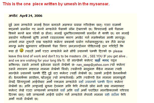 mr. president of nepal, तपाईंले कुरा अलि नबुझेझै लाग्यो वा बुझेरपनि मन्दबुद्धी को रोग लागेझै लाग्यो ।प्रचन्ड लाई गाली गर्दैमा राजा समर्थक हुँदैन ।न त मन्डलेको बिरोध गर्दैमा नेपालको भावी प्रेसिडेन्ट बनिन्छ ।कुरा के हो भने, सेतोलाई सेतो र कालोलाई कालो भन्न सक्नु पर्छ ।उमेशले कैयो पटक कालो लाई सेतो बनाएको कोहिबाट लुकेको छैन ।बस् हाम्रो इच्छा यती मात्र हो कि उमेश को ब्लग पत्रकारिता निस्पक्छ हुनुपर्यो ।राजाले गल्ती गरेको होला,तर प्रचन्ड मात्र दुधले नुहएको जन्तु हैन ।त्यो पनि उजागार गर्नु पर्यो ।जहाँसम्म खुट्टा तान्ने कुरा छ, यो थ्रेड मा लेखिएका कुराहरु खुट्टा तान्न हैन उमेश् को बुद्धिको बिर्को उघार्ने प्रयास् हो।बाकि रह्यो हुतिहारा भन्ने सव्द। हुतिहारा तेस्तालाइ भनिन्छ जो कालो देख्दा देख्दै पनि सेतो भन्छ।जस्तै स्वयम् तपाई। लौ, सुभकामना तपाईलाई प्रचन्ड-पथ को।