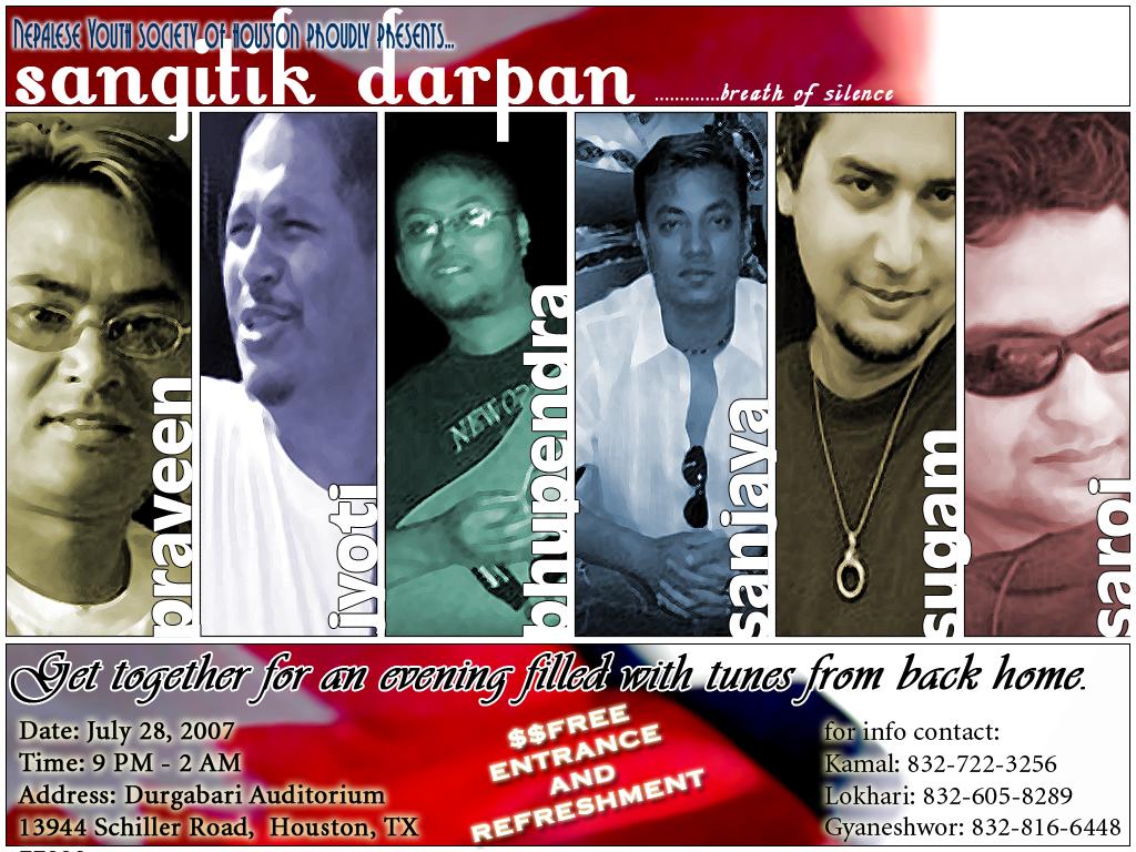 Here's the invitation!!! Dear Friends, On behalf of Nepalese Association of Houston (NAH) and the Youth Group of Houston, I take pleasure in inviting you, your family and friends to the Nepali Musical Nite "Sangitik Darpan" on Saturday, July 28 at 9:00 p.m. at Durgabari Auditorium, 13944 Schiller Road, Houston, Texas 77082. This musical/cultural extravaganza will feature the famed artists Sanjaya Shrestha, Sugam Pokhrel, Praveen Manadhar, Jyoti Ghimire, Bhupendra Bajracharya and Saroj Dutta from Nepal. The entrance to this concert will be free and refreshments will be provided. Funds will be collected for the Nepalese Association of Houston "NAH Emergency Fund" and "Future Nepali Cultural Programs" in this concert. " So please open your hearts, make generous contributions and support our fund drive for noble causes." Kindly spread the news about this concert to the people you know. Come one! Come all!! Let us have some fun in Houston!!! Best regards, Rajendra Shrestha .........................................................................