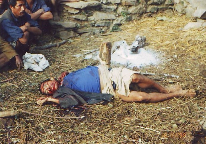 मिस्टर भट्ट् राई र मिस्टर प्रचण्ड, ल अबत राजाले गल्ती गरे, दरबार त्यागे तर तिमिहरु द्वारा नेपाल का सोझा सिधा जनताको हत्या भएको छ। त्यसको छानबिन हुनेकी नहुने? तिमिहरुलाई ससक्त कार्बाही हुने कि नहुने? यसको जबाफ दे हत्यारा हरु। ल हेर तल का फोटोहरु तैंले कसरी नेपाली निमुखा जनताको हत्त्या गरिस। अब संम्पुर्ण नेपाली जनताहरु यिनिहरु को बिरुद्दमा खुलेर लाग्नु पर्छ। बाबुराम र प्रचण्ड लाई झुण्डयाउनु पर्छ।