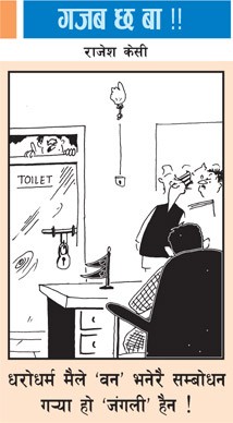 धेरै जना ले देशमा कानून ले केही गरेको छैन भनेर भन्ने होला। त्यसो भए, कानून संबिधान अनुसार मन्त्रिज्यू किन सपथ खानु हुन्छ? निर्बाचन् आयोगको कानून नियम मानेर किन चुनिनु हुन्छ? तलब भात्ता किन हसुर्न हुन्छ। जंगलमै जानुस्, जंगली राजा गर्नुस्। ट्वाइलेट् मा मात्र होइन, अन्त जहाँ जहा मन लाग्छ थुन्नुस्। शान्ती प्रकृया मा सामेल भएर देश को मूल राजनीतिमा आए पछी त नियम कानून मान्नु पर्यो नि। माओवादी मन्त्री भएकैले यात्रो हल्ला गरेको भन्नु हुन्छ एक थरी विद्वान हरु। माओवादी के खाओबादी ले गरेको भए पनि नराम्रो कुरा लाई नराम्रो भन्नु पर्छ, आफुमा अलिकती पनि बिबेक छ भने। होइन भने जे गरे पनि ठीक छ। राजाको प्रत्यक्ष शासन कालमा पनि केही यादब जस्ता सन्काह छेत्रीय प्राशासकहरुले कर्मचारीलाई ट्वाइलेट् मा थुनेका थिए, त्यती बेला पनि यस्तै बिरोध भएका थिए। हजारौं कर्मचारीहरुले देशमा लोकतन्त्र पुनर्स्थापना को लागि आन्दोलनमा भाग लिएका थिए। ती सब चोर् भए, आफु सत्ता मा पुग्ने बितिक्कै? त्यसैलेमन्त्री यादव को ठाउंमा स्यादब भए पनि आमानबिय र गैरकानूनी काम को निन्दा गर्नै पर्छ। एक थरी जसले राम हरी श्रेष्ठ को हत्या पनि स्याबास कामरेड भनेर ताली पिटेका छन, तिनिहरुको हक मा यो लागु हुँदैन। हत्या हिंसा त तिनको संस्कार हो। ट्वाइलेट् प्रकारअण त सानो घाऊ जती पनि भएको छैन। राजाको शासन पनि यस्तै यस्तै गल्तिहरुको लामो पुलिन्दाबाट सुरु भएर अन्तमा नामोनिशान मेटिए। कंस, हिरण्यकश्यपुर को कथा, कथा मात्र थिएन। बुझ्ने लाई श्रीखण्ड नबुझ्नेलाई रक्त चन्दन।
