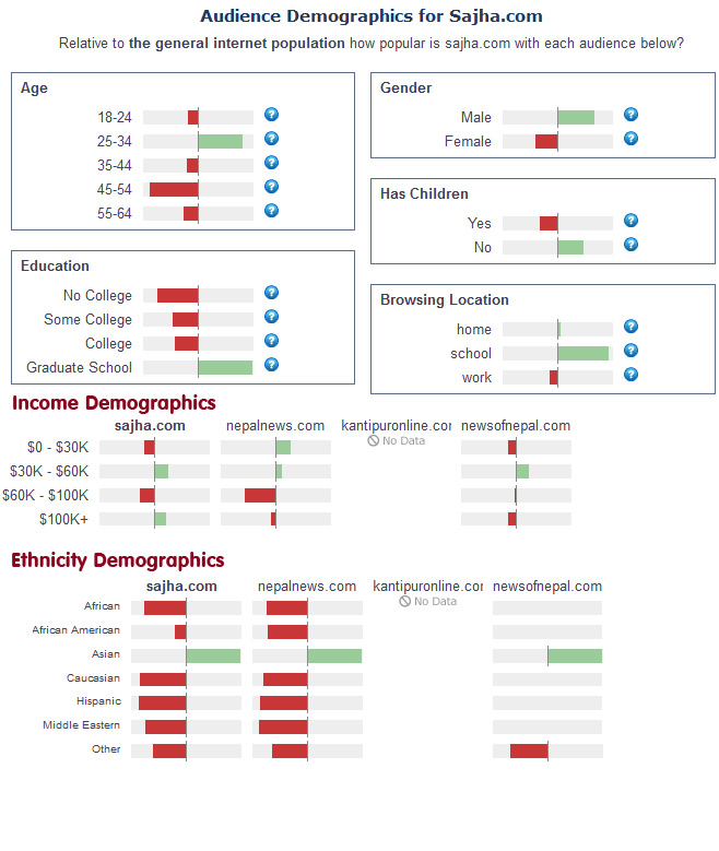 The information cannot be 100% or even anywhere closer to being accurate but it provides a benchmark. Alexa relies on users installing the alexa toolbar in order to come up with the demographics and not many sajha users have that toolbar installed.