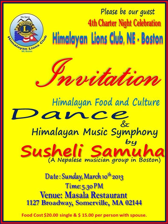 Himalayan Lions Club NE (Boston) is celebrating 4th charter night on Sunday 10th March 2013. The night will be with Lions district dignitaries and all the club members with their families and friends. Also we would like to invite all the other community organizations executive board and members as well.