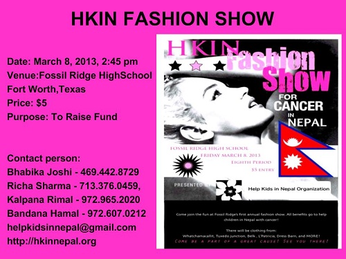 We are pleased to inform you Fossil Ridge High School is hosting its first Fashion Show in partnership with Help Kids in Nepal. HKIN is an organization that aids children with pediatric cancer. Bhabika Joshi, the Youth Ambassador of HKIN, had joined with her school's National Honor Society to organize a charity Fashion Show. The show will be held on March 8 and has been sponsored by Belk, L'Patricia, Dress Barn, Whatchamacallit, and Tuxedo Junction. Over a 100 people are working to pull off this event, including almost 80 models. All profits will go to Help Kids in Nepal. The show is arranged for the students of Fossil Ridge High School.