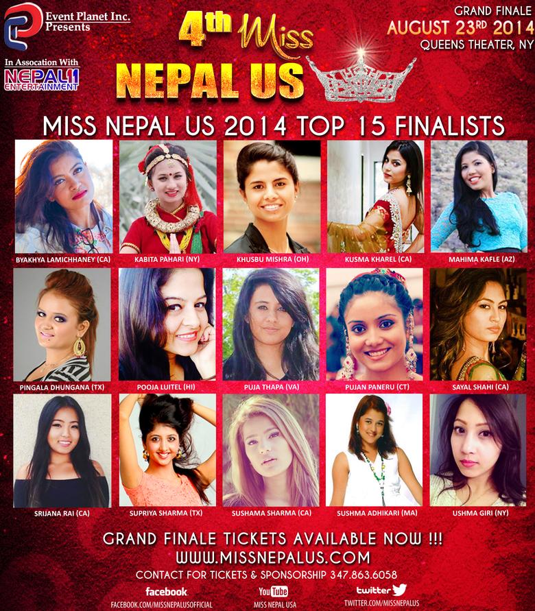 We, Miss Nepal US organizers are thrilled to announce the Top 15 Finalists for the 4th Miss Nepal US (A) beauty pageant event which is scheduled to be held on August 23rd 2014 at the Queens Theater in New York, USA. Congratulation and best wishes to all selected finalist. More details about our top 15 finalists are available at http://missnepalus.com/finalist2014.php. Our talented Top 15 finalists represent various states including California, New York, Ohio, Arizona, Texas, Hawaii, Virginia, Connecticut and Massachusetts. Here is a chance for these talented and aspiring young girls who have traveled to this 'land of opportunity' to earn international fame and add wings to their dreams. Amid wide acclaim and new avenues of success, the winner will be a youth icon for the young generation and add glory to promote the Nepal globally. Please come and support these wonderfully talented young futures of our community during our Grand Finale Show. The tickets are available for purchase online on our official website. http://missnepalus.com/onlineticket.php.