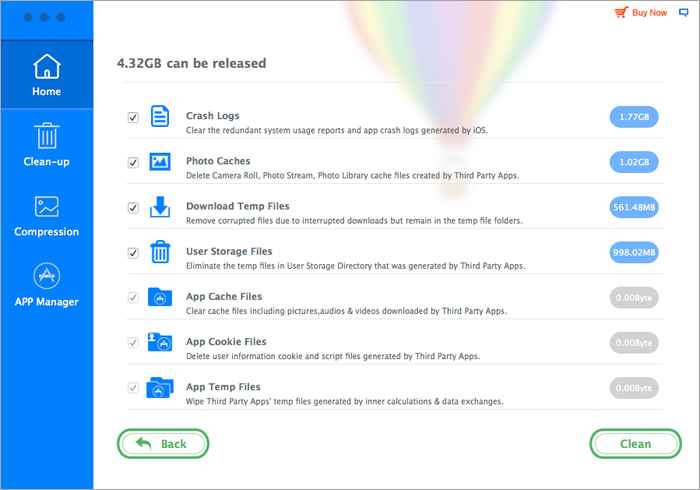 iMyfone Umate is a iPhone space saver software which contains three powerful features to fix the iPhone running of space issue. First, it can clear up junk files created by third-party apps. Second, iMyfone Umate can perform lossless photo compress which can release up to 75% photo space. iPhone users can store their precious photos on iPhone instead of deleting them. Third, it enables iPhone users manage third-party apps. iPhone users can preview how much iPhone space every app takes and select which to remove.