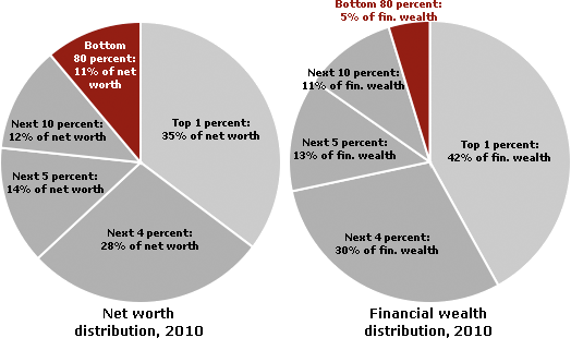 In the United States, wealth is highly concentrated in a relatively few hands. As of 2010, the top 1% of households (the upper class) owned 35.4% of all privately held wealth, and the next 19% (the managerial, professional, and small business stratum) had 53.5%, which means that just 20% of the people owned a remarkable 89%, leaving only 11% of the wealth for the bottom 80% (wage and salary workers). In terms of financial wealth (total net worth minus the value of one's home), the top 1% of households had an even greater share: 42.1%.
