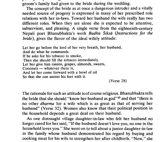 The themes which Bhanubhakta wrote about were uncomplicated. Once he went to visit a friend and not only discovered that his friend was on a journey, but that his wife was extremely rude to wayfarers. Guests and wayfarers were never treated casually by the people of his time. Houses were few and far between and if anyone refused to shelter a traveler, the traveler might have to walk several miles before finding another resting place. On top of this, there were many stories of gods who came in the guise of humans seeking shelter and judged the homeowners by their conduct. Bhanubhakta was shocked by her attitude and wrote: